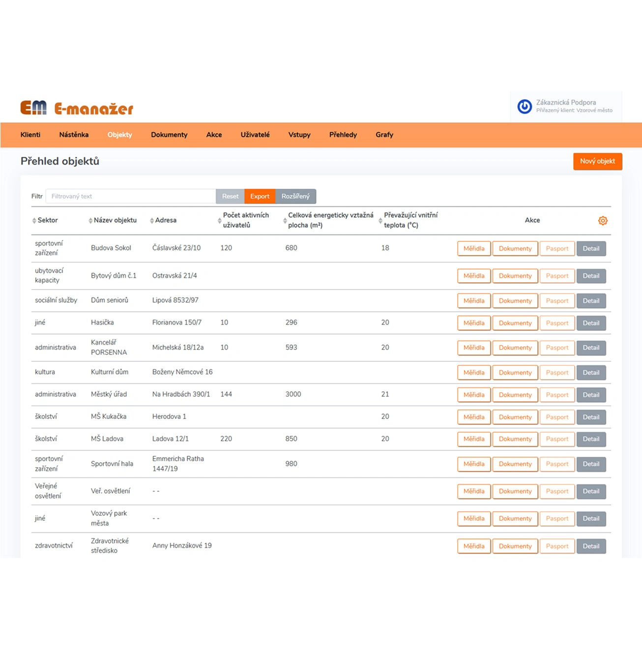 Datovou evidenci dat a dokumentů, kompletní přehled majetku (objektů, odběrných míst, zdrojů) a optimalizaci energetického hospodářství.